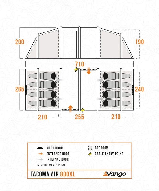 The Vango Tacoma Air 800XL features a vis-a-vis configuration with AirBeam® inflatable technology, accommodating 8 campers. Strategic airflow vents enhance ventilation throughout the structure. This tent prioritizes privacy with separate sleeping quarters flanking a spacious central living area. Diamond Clear windows flood the interior with natural light, complemented by adjustable toggled curtains for nighttime privacy. Constructed with Dynamic Weave 100™ Fabric, the tent maintains durability while minimizing weight and pack size. Consider adding the optional side awning to create additional covered storage space for equipment.